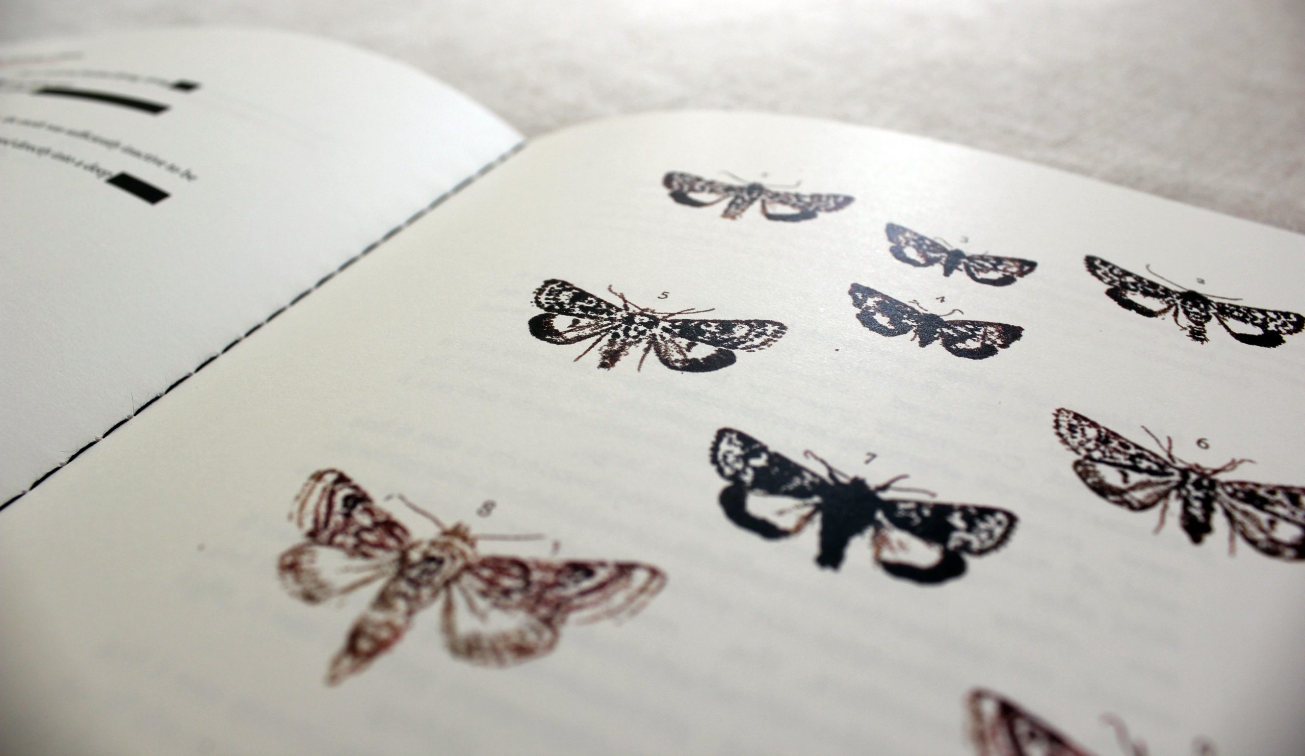 In the design of Red Fifty Five is a material poetics in addition to the poetics within. The scarlet covers and the debossed numeral ‘55’ speak directly to the Red Data Book, founded in 1964 by The International Union for Conservation of Nature, which is an inventory of the global conservation status and extinction risk of biological species. Red Fifty Five references the moths of the UK which are Critically Endangered, Endangered or Vulnerable in today’s edition of the Red Data Book. The black end papers are the pitch dark of the night in which moths fly and where the fifty five can be found. The images of moths are taken from a Victorian moth book. They are reimagined as fading out much like the watercolour images in the Victorian moth book, and in reality. The binding of the chapbook is singer sewn in black thread, and this reenacts the pinned, folding-out-flat of the wings of displayed dead moths, a Victorian collecting habit that still persists. The black thread together with the ebony end papers are a materialisation of the mourning of so many lost and missing moths. The black foiled text on the rear cover shimmers when turned in the light, just like the scales that make up moth wings on a moonlit night.